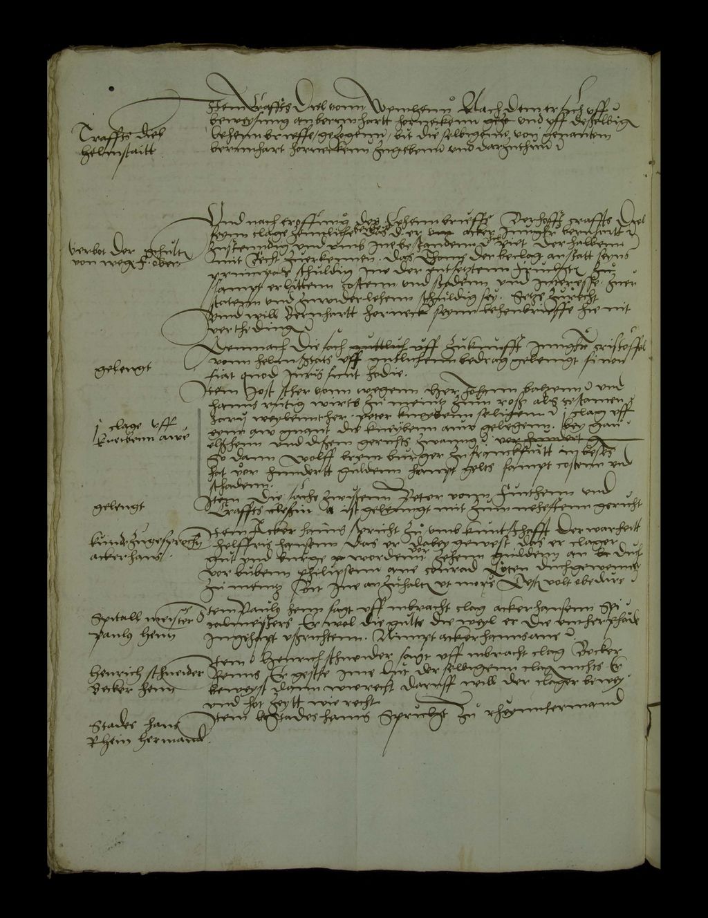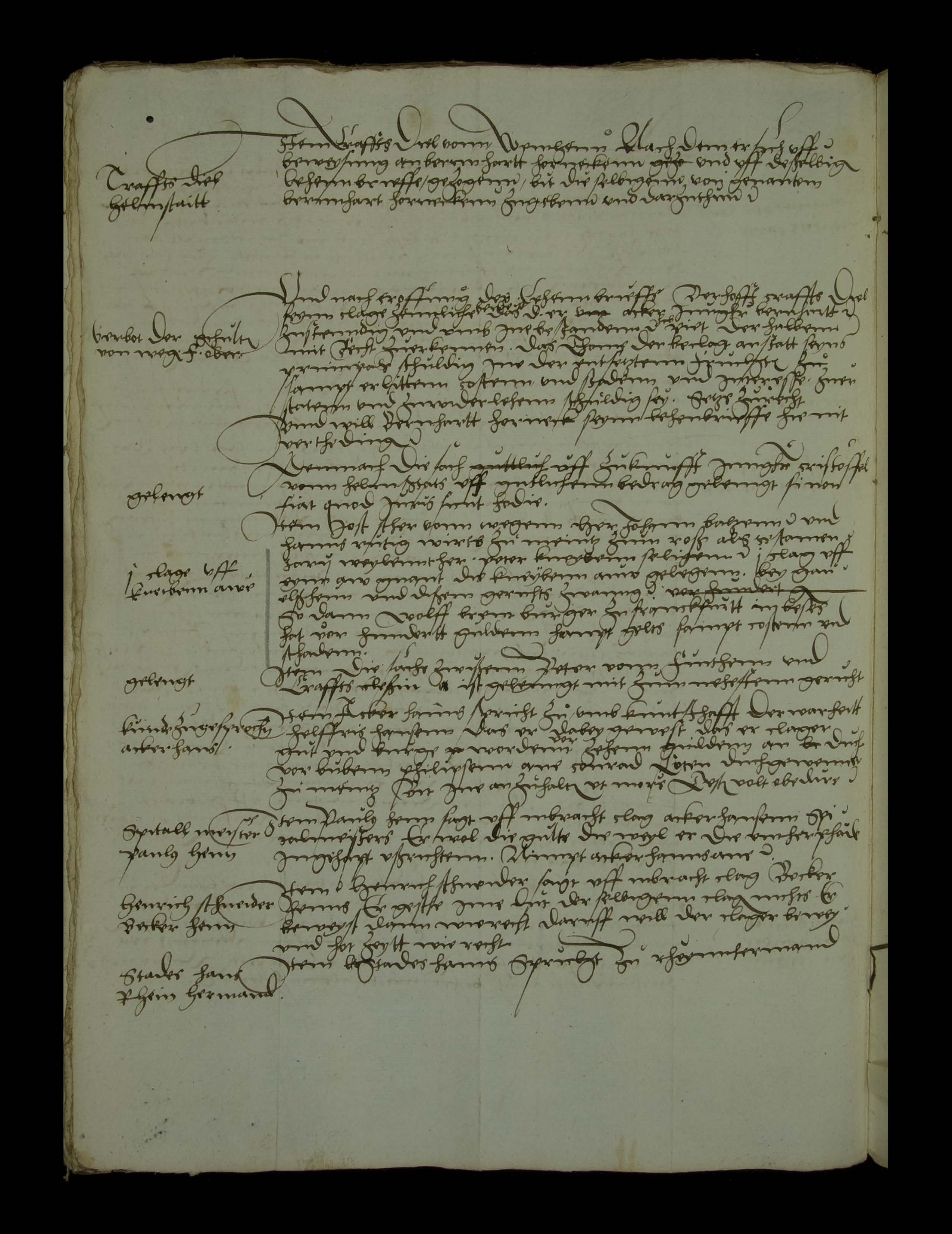 Und nach Eröffnung des Lehenbriefs hofft Diel Krafft seine Klage geziemend bewiesen zu haben, dass der Acker Jungherr Bernhard usw. gehört und er ihn von ihm gepachtet usw. habe. Er beantragt deshalb, gerichtlich anzuerkennen, dass Thome der Beklagte, anstelle seines Prinzipals schuldig ist, ihm die entfremdeten Früchte samt den erlittenen Gerichtsgebühren, Auslagen und Zinsen zu erstatten und zurückzugeben. Er bringt das vor Gericht und will Bernhard seinen Lehenbrief hier nicht verhandeln usw.