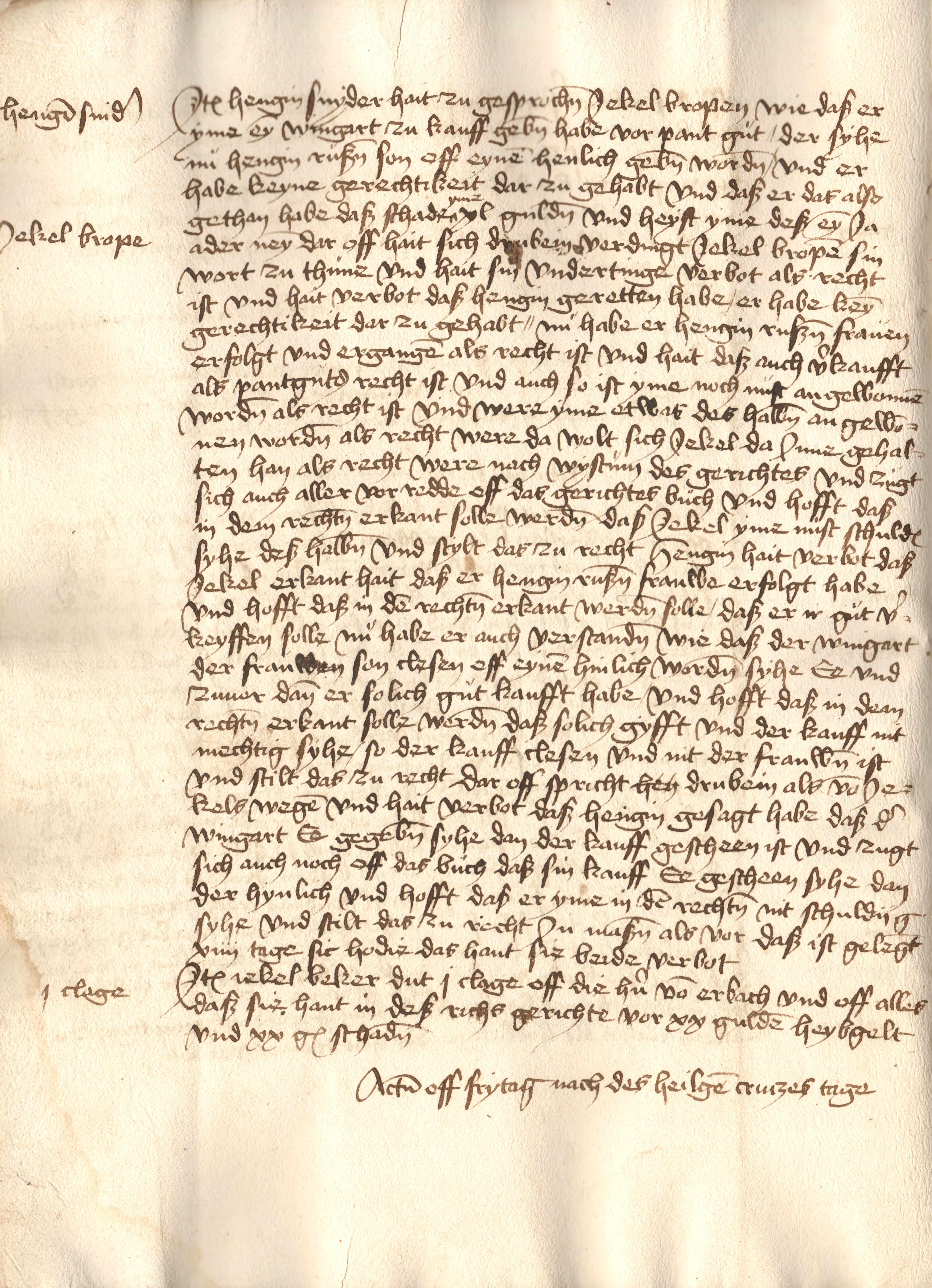 Hengin Schneider hat Jeckel Bropp angeklagt, dass er ihm einen Wingert zum Kauf gegeben habe als Pfandgut. Der sei nun dem Sohn von Hengin Ruße auf eine Eheabsprache gegeben worden. Er habe also keinen Besitz daran gehabt. Dass er das so gemacht habe, das schade ihm 40 Gulden und er fordert von ihm ein Ja oder Nein. Darauf hat sich Drubein verpflichtet, Jeckel Bropp vor Gericht zu vertreten und hat seine Anwaltschaft festhalten lassen, wie es Recht ist. Und er hat festhalten lassen, dass Hengin gesagt habe, er habe keinen Besitz daran gehabt. Nun habe er gegen die Frau von Hengin Ruße geklagt und gegen sie gewonnen wie es Recht ist. Und er hat das auch verkauft wie es Pfandgutrecht ist. Und es ist ihm auch nichts vom Gericht abgenommen worden. Und wäre ihm deswegen etwas vom Gericht abgenommen worden, dann wolle sich Jeckel verhalten, wie es Recht wäre, gemäß dem Urteil des Gerichts. Und er beruft sich wegen aller Vorrede auf das Gerichtsbuch. Und er hofft, dass vom Gericht erkannt werde, dass Jeckel ihm deswegen nichts schuldig sei. Das legt er dem Gericht vor. Hengin hat festhalten lassen, dass Jeckel anerkannt habe, dass er gegen die Frau von Hengin Ruße seinen Anspruch eingeklagt habe. Und er hofft, dass vom Gericht erkannt werden solle, dass er ihr Gut verkaufen solle. Nun habe er auch verstanden, dass der Wingert dem Sohn der Frau auf der Eheabsprache übertragen worden sei, bevor er die Güter gekauft habe. Und er hofft, dass das Gericht urteilt, dass die Übergabe und der Kauf nicht gültig seien, da er von Clese gekauft hat und nicht von der Frau. Das legt er dem Gericht vor. Darauf sagt Drubein für Jeckel und hat festhalten lassen, dass Hengin gesagt habe, dass der Wingert übergeben worden sei, bevor der Kauf geschehen sei. Und er beruft sich auch auf das Buch, dass sein Kauf früher geschehen sei als die Eheabsprache. Und er hofft, dass er ihm nichts schuldig sei. Das legt er dem Gericht vor wie zuvor. Das ist verschoben worden um 14 Tage. Das haben sie beide festhalten lassen.