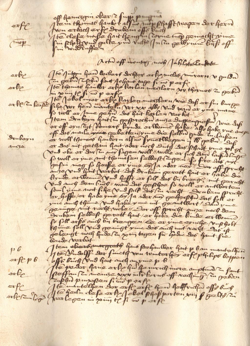 Drubein hat Antze Duppengießer angeklagt, dass er vor einiger Zeit gegen Romers Kinder gewonnen habe. Da habe ihn Antze damals gebeten, ihm dieselben Güter zu lassen, er wolle Thomas Haubor seinetwegen 2 Pfund geben. Dass er das nicht getan hat oder noch tut, das schade ihm 40 Gulden. Und wenn er dazu Nein sagen wolle, wolle er sich das dann beweisen lassen, so wolle er ihm das mit Thomas selbst beweisen; wenn das nicht sein mag, so fordert er von ihm ein Ja oder Nein. Darauf redet Antze und hat festhalten lassen, dass Drubein gesagt habe, er habe gegen die Kinder gewonnen. Und er hofft, er solle das beweisen durch das Gericht und auch das Gerichtsbuch. Wenn das geschehe, so wolle er antworten, soviel ihm notwendig sei und legt das dem Gericht vor. Drubei sagt: Er habe von ihm ein Ja oder Nein gefordert. Er hoffe, das solle er ihm auch tun und er habe ihm nicht geantwortet, wie es ihm dem Recht nach genüge.