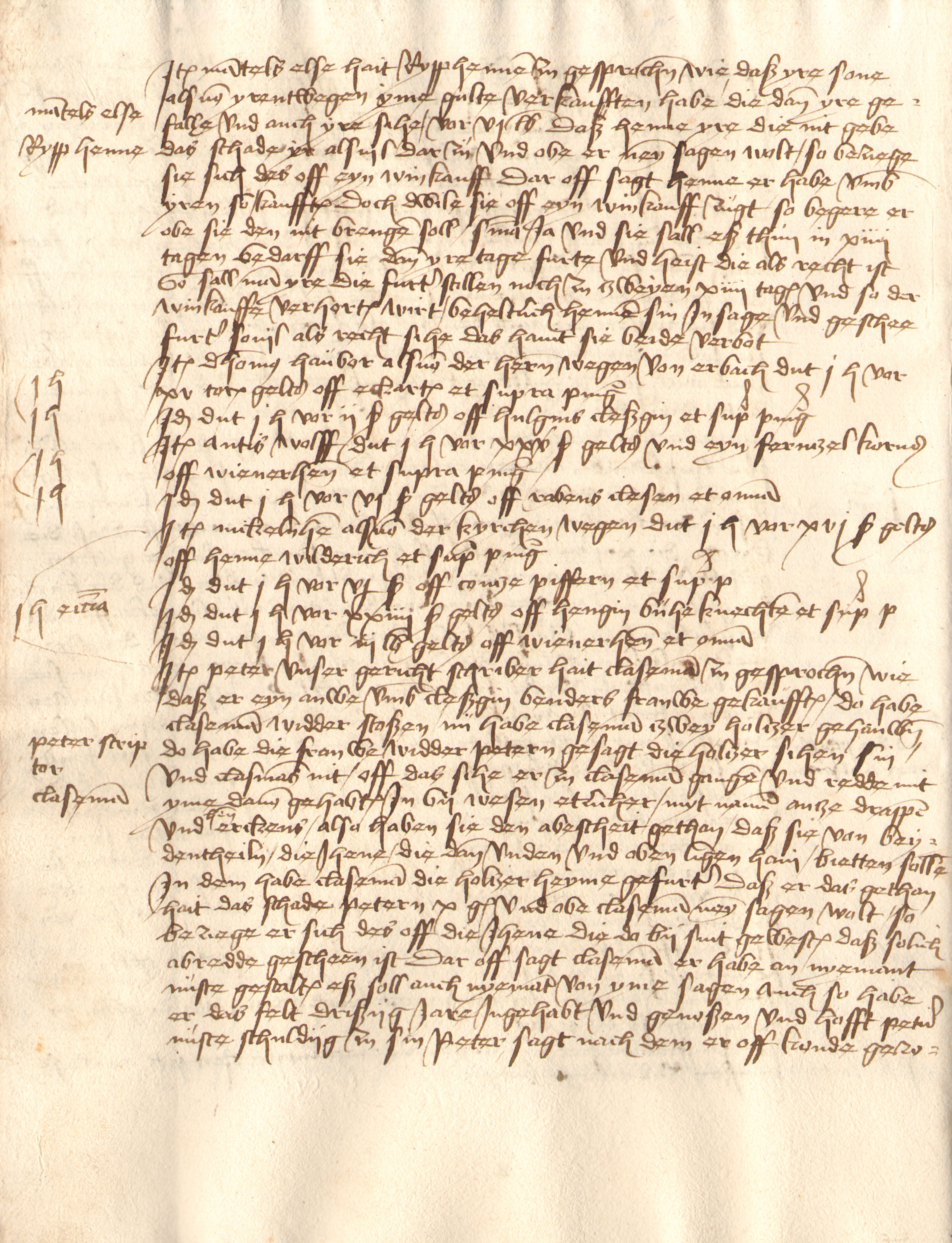 Peter, unser Gerichtsschreiber, hat Claseman angeklagt, dass er eine Aue von der Frau von Clesgin Bender gekauft hat, die an Clasemans angrenze. Nun habe Claseman zwei Bäume gehauen. Da habe die Frau zu Peter gesagt, das Holz sei ihr und nicht Claseman. Darauf sei er zu Claseman gegangen und habe mit ihm geredet in Anwesenheit etlicher Männer, nämlich von Antze Drapp und Henne Erke. Darauf haben sie einen Beschluss gefasst, dass sie von beiden Seiten diejenigen, die unten und oben Besitz liegen haben, aufbieten sollen. Während dessen habe Claseman die Bäume nach Hause geführt. Dass er das getan habe, das schade Peter 10 Gulden und wenn Claseman Nein sagen wolle, so berufe er sich deswegen auf diejenigen, die dabei waren, als der Beschluss geschah. Darauf sagt Claseman: Er habe von niemandem nichts festgesetzt bekommen, es soll auch niemand von ihm sagen. Außerdem habe er das Feld 30 Jahre lang innegehabt und genossen. Und er hofft, Peter nichts schuldig zu sein. Peter sagt, nachdem er sich auf Beweise berufe,