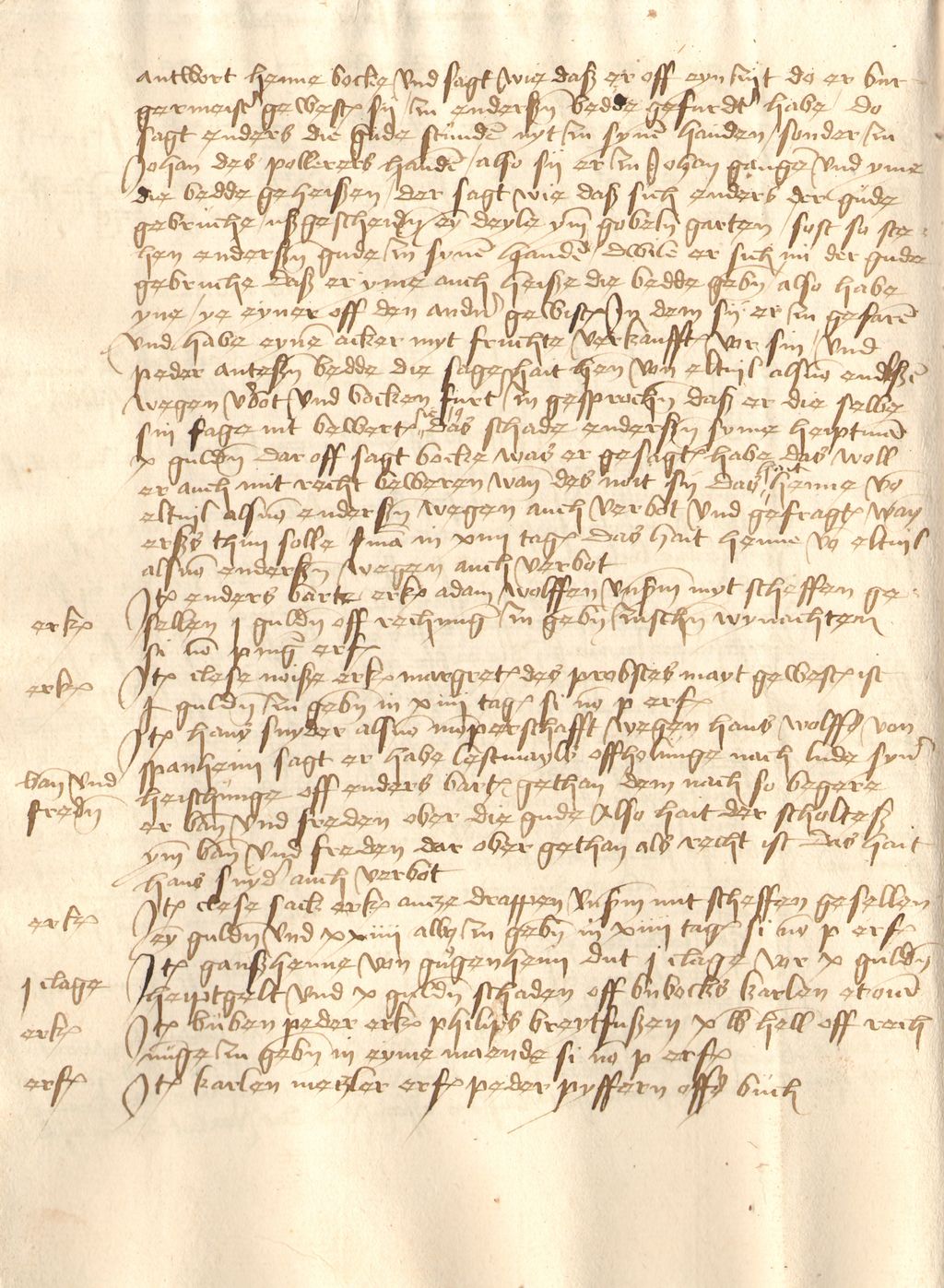 antwortet Henne Back und sagt, dass er zu der Zeit, als er Bürgermeister war, von Enders die Bede gefordert habe. Da sagte Enders, die Güter seien nicht in seinem Besitz sondern in den Händen von Johan dem Pollerer. Darauf sei er zu Johan gegangen und habe von ihm die Bede gefordert. Der sagte, dass Enders die Güter habe, ausgenommen einen Teil im Gobelgarten, sonst seien sie in Enders Besitz. Weil er nun die Güter nutzte, fordere er auch, dass er die Bede gebe. So habe einer auf den anderen verwiesen. Während dessen sei er hingefahren und habe einen Acker mit Frucht verkauft für seine Bede und die von Peter Anthes. Die Aussage hat Henne von Eltville für Enders festhalten lassen und Back weiter angeklagt, dass er seine Aussage nicht beeide. Das schade ihm für Enders, seinen Mandanten 10 Gulden. Darauf sagt Back, was er gesagt habe, das wolle er auch beeiden, wenn das nötig sei. Das hat Henne von Eltville für Enders festhalten lassen und gefragt, wann er es tun solle. Urteil: In 14 Tagen. Das hat Henne von Eltville auch für Enders festhalten lassen.