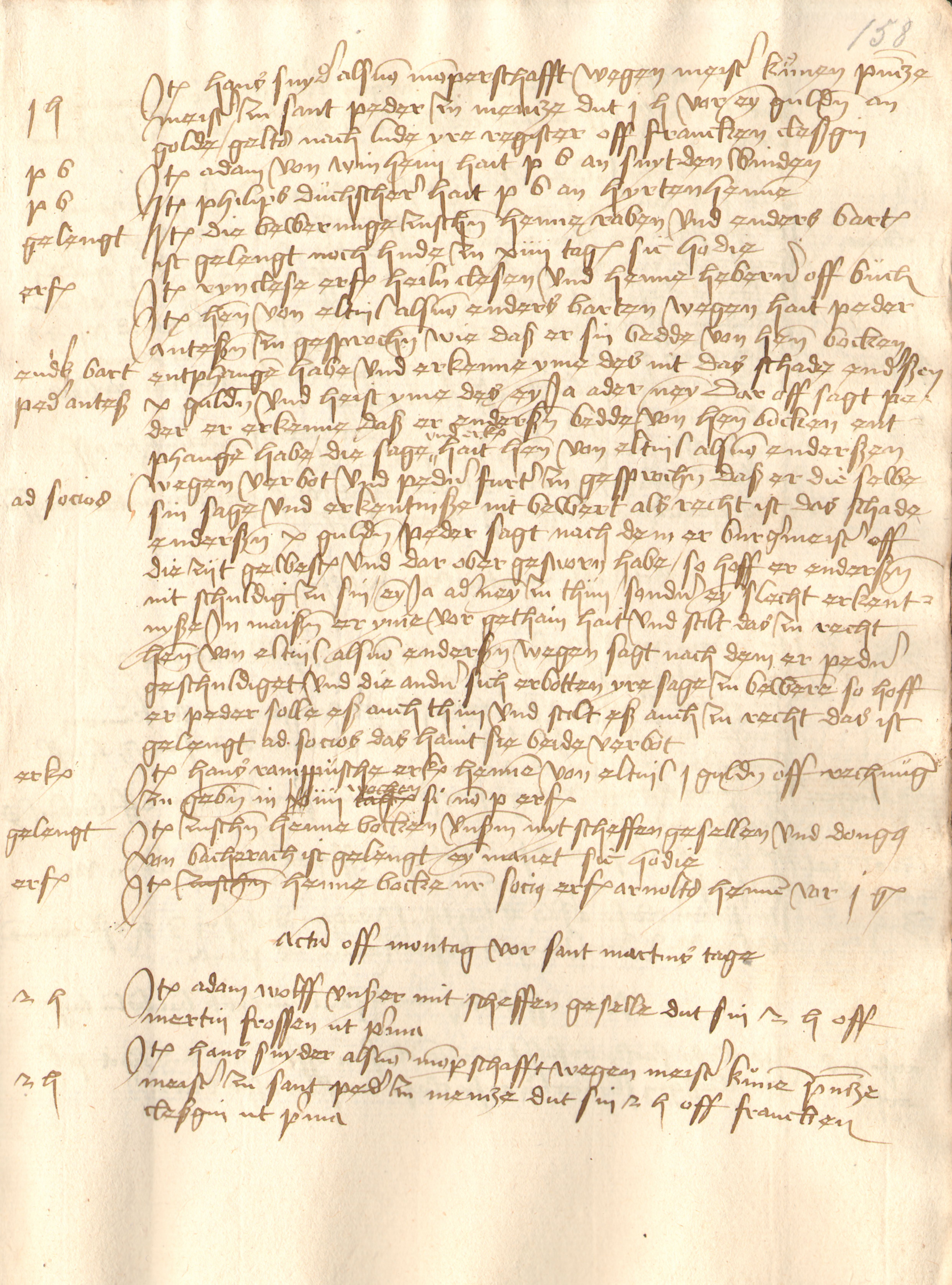 Henne von Eltville hat für Enders Bart Peter Anthes angeklagt, dass er seine Bede von Henne Back erhalten habe und erkenne ihm das nicht an. Das schade Enders 10 Gulden. Und er fordert von ihm ein Ja oder Nein. Darauf sagt Peter: Er erkenne an, dass er die Bede von Enders durch Henne Back empfangen hat. Die Aussage und das Geständnis hat Henne von Eltville für Enders festhalten lassen und Peter weiter angeklagt, dass er seine Aussage und das Geständnis nicht beeide, wie es Recht ist. Das schade Enders 10 Gulden. Peter sagt; Nachdem der Bürgermeister da war und er das geschworen habe, so hoffe er, Enders nicht schuldig zu sein, ein Ja oder Nein zu tun, sondern nur ein schlichtes Geständnis, wie er es zuvor gemacht hat. Das legt er dem Gericht vor. Henne von Eltville für Enders sagt: Nachdem er Peter beschuldigt hat und die anderen angeboten haben, ihre Aussage zu beeiden, so hoffe er, Peter solle es auch tun und legt es dem Gericht vor. Das ist verschoben worden bis zum Zusammentreten des Vollgerichts. Das haben sie beide festhalten lassen.
