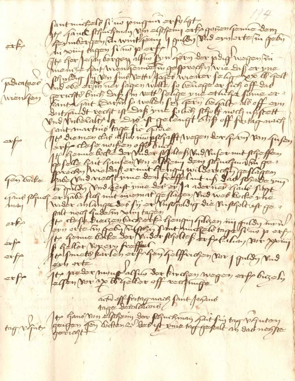 Henne Back, der Unterschultheiß und unser Mitschöffe, hat Hans von Elsheim, den Schuchmann angeklagt, dass er sich mit Hengin Wilderich geschlagen habe und richtet ihm den Frevel nicht aus. Das schade ihm einen Gulden und er fordert von ihm ein Ja oder Nein. Hans sagt, er habe sich mit niemandem geschlagen und wessen Back ihn belange, dessen sei er unschuldig. Die Unschuld ist festgesetzt für 14 Tage.