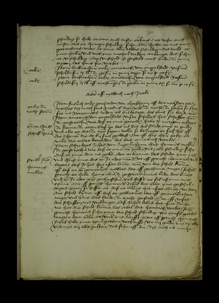 Schreiber Johannes von Ingelheim hat Heinrich Muller beschuldigt, er sei ihm 1 Gulden und 1 Albus schuldig. Dass er ihm die nicht gebe oder zuerkenne, das schade ihm 1 Gulden. Der Schreiber fordert dazu ein Ja oder ein Nein. Darauf redet Henne und fordert, das Johannes sich äußert, woher die Schuld stammt, damit er eine sorgfältige Antwort darauf geben kann. Johannes antwortet, er habe Heinrich nach Wortlaut des Gerichtsbuches beschuldigt und ein Ja oder Nein gefordert und hofft, er solle es auch tun. Darauf redet Heinrich, Johannes habe ihn beschuldigt, deshalb hoffe er, er werde sich angemessen äußern, woher die Schuld stammt, damit Johannes sorgfältig darauf antworten kann. Das haben sie beide dem Gericht vorgelegt. Darauf weist das Schöffengericht unter Vorbehalt, dass sich Johannes angemessen äußern soll, woher die Schuld stammt. Dieses Urteil hat Heinrich bei Gericht festgehalten. Johannes sagt, Heinrich sei ihm das Geld wegen eines Gartens schuldig, den er von ihm gekauft habe. Darauf sagt Heinrich, Johannes habe ihm einen Garten verkauft für 4 Gulden abzüglich 3 Albus und mit 3 Albus Gülte. Es sei es zurzeit auch nicht mehr,