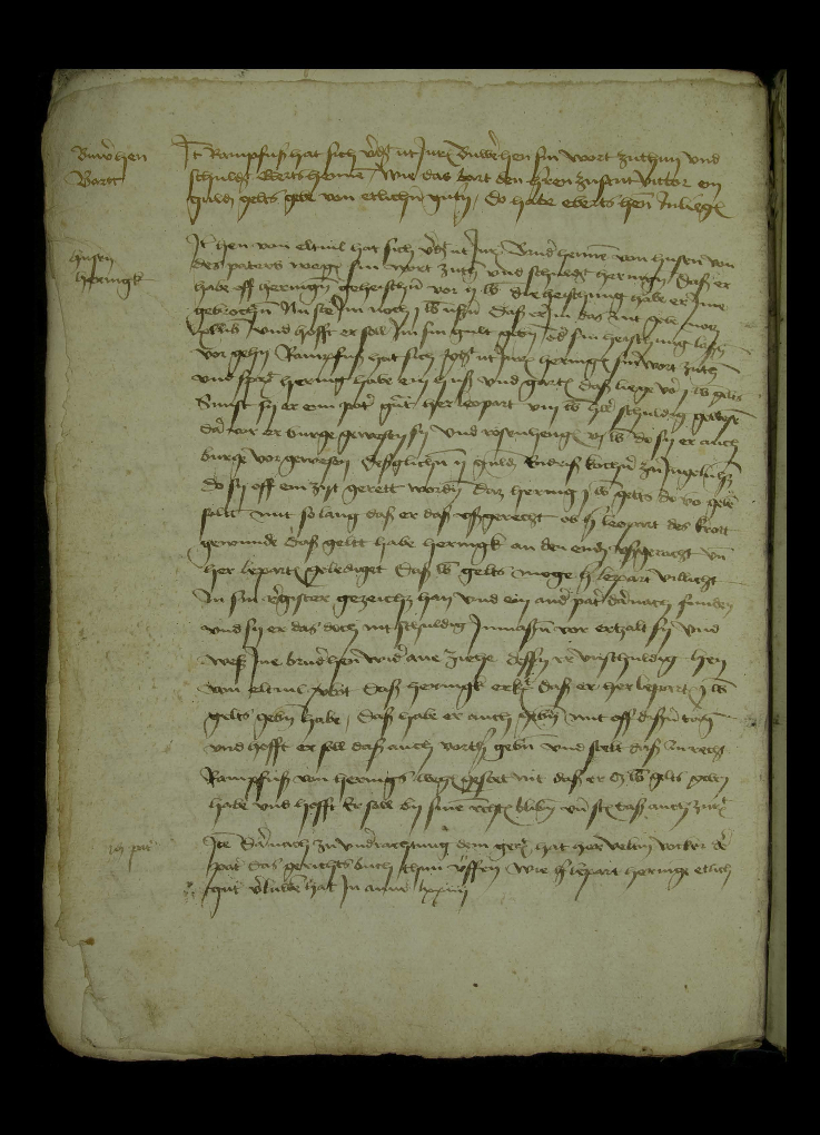 Henne von Eltville hat sich verpflichtet, wie es Recht ist, Bruder Henne von Hausen für den Pater vor Gericht zu vertreten und beschuldigt Hering. Er habe von Hering gefordert wegen 2 Pfunde. Die Heischung habe er ihm unterbrochen. Nun steht noch 1 Pfund aus. Dass er ihm das nicht gibt, schade 40 Pfund. Er hofft, er soll ihm seine Gülte geben oder die Heischung weitergehen lassen. Rampfuß hat sich verpflichtet, wie es Recht ist, Hering vor Gericht zu vertreten und sagt, Hering habe ein Haus und einen Garten, die liegen für 1 Pfund Geld. Sonst ist er einem Pater namens Herrn Lepart 8 Pfund Heller schuldig gewesen, für die er Bürge gewesen ist und Hengin Rose 6 Pfund. Dafür ist er auch Bürge gewesen, desgleichen 2 Gulden Endres Kocher zu Ingelheim. Da ist seinerzeit gesagt worden, dass Hering 1 Pfund Geld davon so lange geben soll, bis er das bezahlt hat. Wenn Herr Lepard das als Kummer empfinde, das Geld habe Hering schließlich gezahlt und Herrn Lepard ledig gemacht. Das Pfund Geld möge Herr Lepard vielleicht in seinem Register verzeichnet und ein anderer Pater danach gefunden haben. Er ist das doch nicht schuldig, so wie das zuvor beredet sei. Weshalb in Bruder Henne weiter belangt, daran ist er unschuldig. Henne von Eltville hält bei Gericht fest, dass Hering zugesteht, dass er Herrn Lepard 1 Pfund gegeben hat, das hat er auch bis auf den heutigen Tag gegeben und hofft, er soll es auch weiterhin geben und legt das dem Gericht vor. Rampfuß gesteht für Hering nicht, dass er das Pfund Geld gegeben habe und hofft, er soll bei seinen Rechten bleiben und legt das auch dem Gericht vor.
