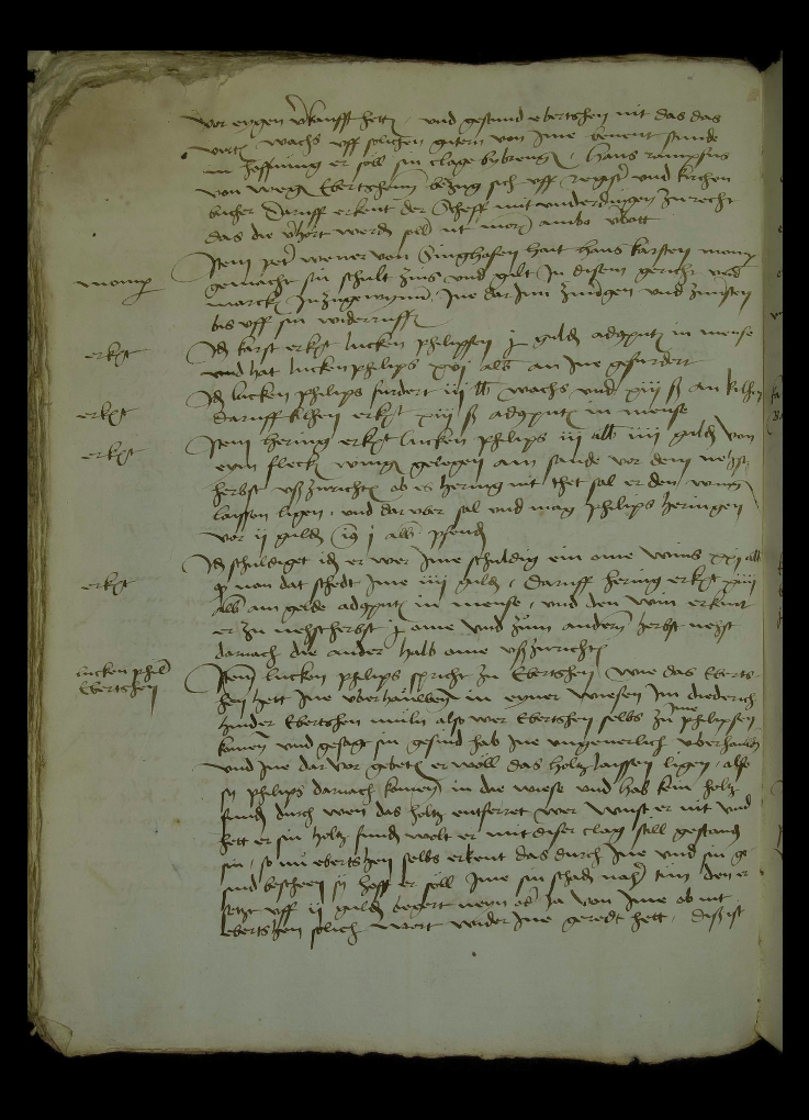 Philip Lucke sagt zu Henne Ebert, Henne habe ihn übermäßig abgeholzt in einer Wiese, im Diederich hinter der Mühle des Henne Ebert. Henne Ebert sei selbst zu ihm, Philip, gekommen und habe gesagt, sein Gesinde habe ihn ohne Gefährde überholzt und ihn dafür gebeten, er wolle das Holz liegen lassen. Also sei Philip danach auf die Wiese gekommen und habe kein Holz vorgefunden. Durch wen das Holz entfernt wurde, wisse er nicht. Hätte er sein Holz gefunden, hätte er mit dieser Klage abgewartet. Da nun Henne Ebert selbst anerkennt, dass das durch ihn und sein Gesinde geschehen sein, geht er davon aus, Henne soll ihm seinen Schaden gewähren, den er auf 2 Gulden ansetzt. Er fordert ein Nein oder Ja von ihm, ob Henne Ebert solche Worte gegen ihn geredet hatte. Das ist