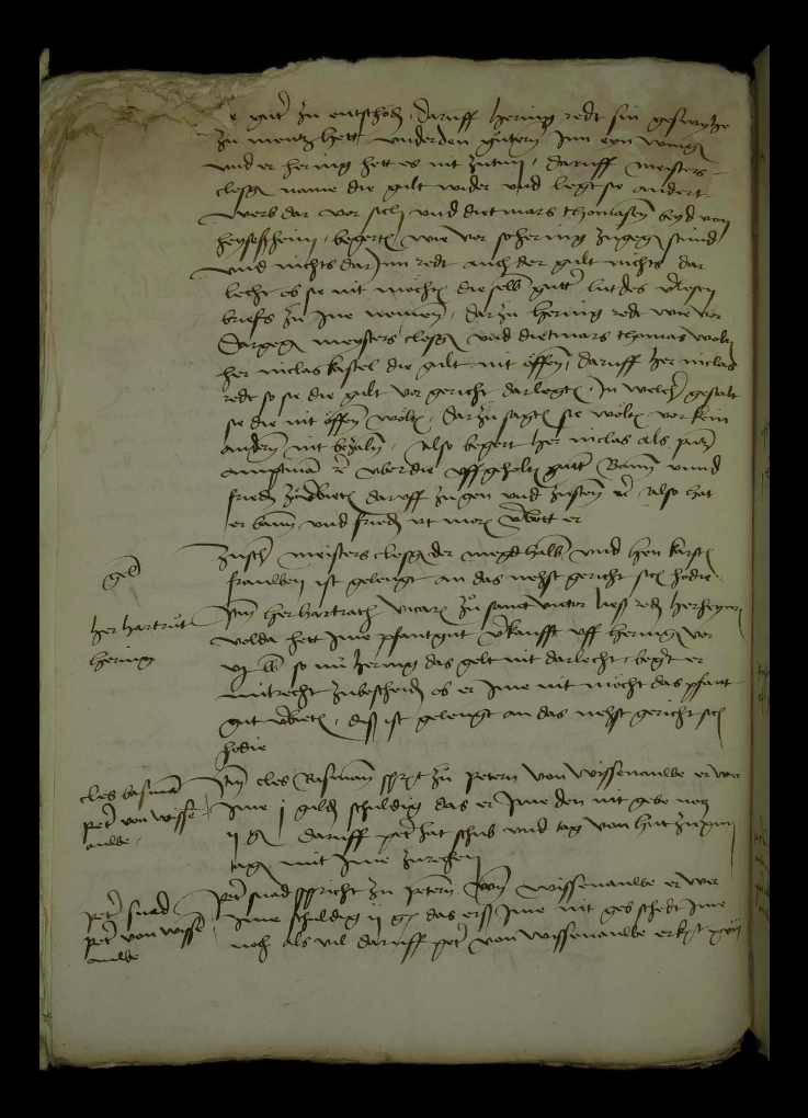 Güter zu entlasten. Darauf sagt Hering, seine Schwäger zu Mainz hätten unter den Gütern einen Wingert inne. Er, Hering, habe es nicht zu tun. Darauf nimmt Meister Clesgin die Gülte wieder und bezahlt sie anders für sich und Dietmar Thomas, beide von Heidesheim. Sie fordern wie zuvor, da Hering dabeistand und nicht dagegenredete, auch die Gülte nicht bezahlt, ob sie nicht die Güter nach Wortlaut des verlesenen Briefs an sich nehmen könnten. Dazu sagt Hering wie zuvor. Dagegen wollen Meister Clesgin und Dietmar Thomas Herrn Niclas Kastell die Gülte nicht offenlegen. Darauf sagt Herr Niclas, wenn sie die Gülte vor Gericht bezahlen, in welcher Gestalt wollen sie die nicht offenlegen. Dazu sagen sie, sie wollen für keinen andern bezahlen. Also fordert Herr Niclas als Präsenzamtmann usw. über die eingezogenen Güter Bann und Frieden zu legen, festzustellen und zu verteidigen usw. Also hat er Bann und Frieden wie es Gewohnheit ist. Das hält er bei Gericht fest.