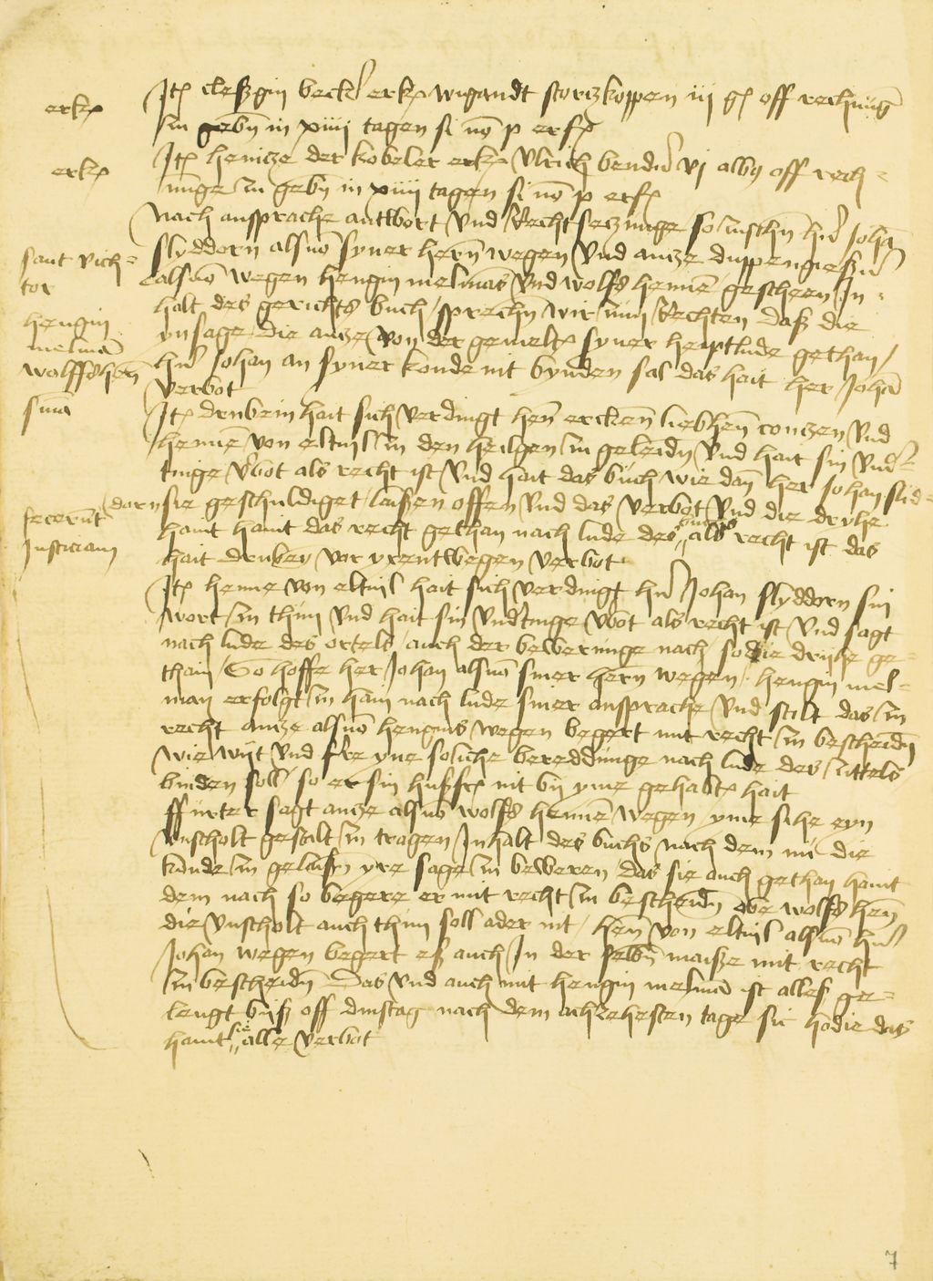 Drubein hat sich verpflichtet, Henne Ercker, Conze Liebhenne und Henne von Eltville zur Eidleistung zu geleiten und hat sein Anstellung festhalten lassen, wie es rechtmäßig ist. Er hat das Gerichtsbuch öffnen lassen an der Stelle, wo Johann Sliddorn sie beschuldigt hatte und hat das vom Gericht festhalten lassen. Und die 3 haben gehandelt wie es das Recht fordert nach Aussage des Buches. Dies hat Drubein für sie festhalten lassen.Henne von Eltville hat sich verpflichtet, Herrn Johann Sliddorn zu vertreten und hat seine Gerichtsvertretung festhalten lassen, und sagt: Nach Aussage des Urteils und auch der Eidleistung, welche die drei getan haben, so hoffe Herr Johann von seiner Herren wegen gegen Hengin Melman gewonnen zu haben gemäß seiner Anklage und legt das dem Gericht vor. Antz begehrt für Johann einen gerichtlichen Bescheid, wie weit ihn diese Beredung nach Aussage des Zettels binden soll, da seine Ehefrau nicht dabei war.