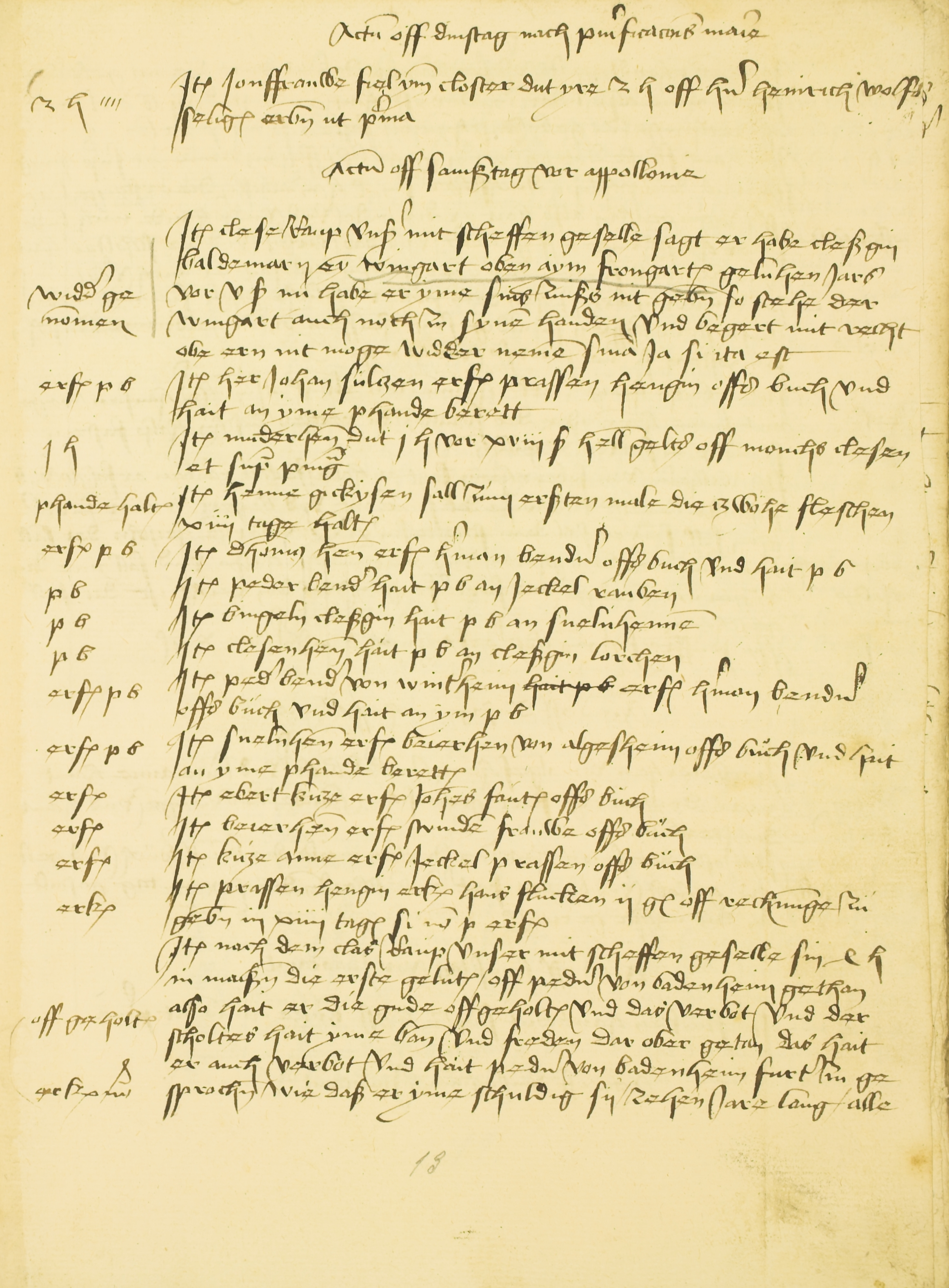 Nachdem Clese Raub, unser Mitschöffe, seine 4. Klage gegen Peter von Badenheim erhoben hat, hat er die Güter eingezogen und das festhalten lassen. Der Schultheiß hat ihm Bann und Frieden gemacht. Das hat er auch festhalten lassen und hat Peter von Badenheim weiter angeklagt, dass er ihm schuldig sei, 10 Jahre lang jedes