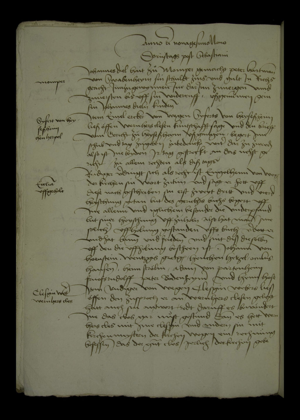 Emel Ercker für Siegfried von Heidesheim ließ die Zeugenaussagen und die Urkunde des Gerichts von Heidesheim öffnen, die Cles Wernher vorgelegt hat. Und er fordert Aufschub und seinen Termin sich zu bedenken um weiter dazu zu reden. Darauf ist ihnen beiden der Termin verschoben worden bis zum nächsten Gerichtstag.