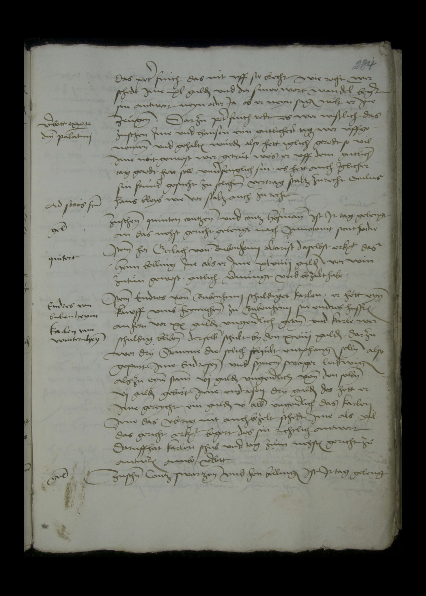 Endres von Bubenheim beschuldigt Karl von Winternheim: Er hätte einen Kauf gemacht von Heinrich zu Bubenheim, dem Ahnherrn von Endres Ehefrau für 20 Gulden ungefähr. Und Karl war an der Schuld rund 18 Gulden schuldig geblieben. Und es sind drei Stämme, die diese Schuld tragen sollen. Daher gebühren Endres und seinem Schwager Ludwig als einem Stamm ungefähr 6 Gulden, von diesen 6 Gulden gebühren ihm, Endres, 3 Gulden. Davon hat er ihm 1 Gulden 5 Albus ungefähr gegeben. Dass Karl das Übrige nicht auch bezahlt, das schade ihm so viel, wie es das Gericht erkennt. Er fordert von ihm eine Antwort vor Gericht. Darauf hat Karl Aufschub und seinen Termin am nächsten Gerichtstag um zu antworten.