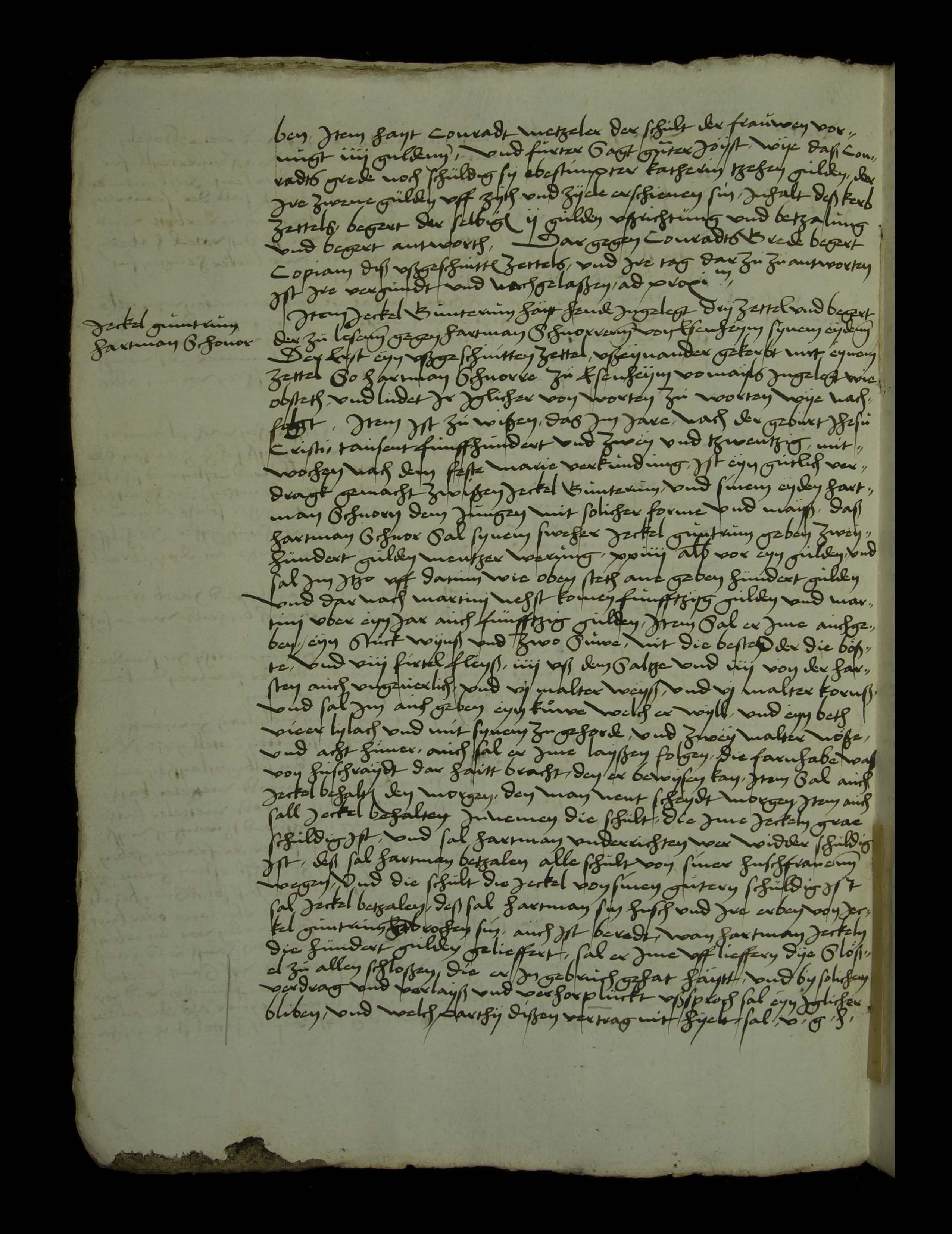 Der erste ausgeschnittene Zettel, auseinander gekerbt mit einem Zettel, den Hartman Schnorr zu Essenheim vormals eingereicht hat, wie das oben steht, lautet wörtlich: Es ist zu wissen, dass am Mittwoch nach Marie Verkündigung [26. März] des Jahres 1522 ein gütlicher Vertrag zwischen Jeckel Gunthrum und seinem Schwiegersohn Hartmann Schnorr dem jungen geschlossen wurde, in dieser Form und dem Maß, dass Hartmann Schnorr seinem Schwiegervater Jeckel Guntrum 200 Gulden Mainzer Währung geben soll, 24 Albus für einen Gulden gerechnet. Er soll ihm am heutigen Tag 100 Gulden und danach am kommenden Martinstag [11. November 1522] 50 Gulden und auf Martini über ein Jahr [11. November 1523] ebenso 50 Gulden geben. Ebenso soll er ihm ein Stück Wein und zwei Säue geben, nicht die besten oder die schlechtesten, und acht Viertel Fleisch, ungefähr vier Viertel gesalzenes und vier von der Lende, und sechs Malter Weizen und sechs Malter Korn. Weiter soll er ihm eine Kuh seiner Wahl geben, ein Bett, vier Bettlaken mit Zubehör, zwei Malter Nüsse und acht Hühner. Dann soll er ihm auch die fahrende Habe, was nachweislich an Hausrat dargebracht ist, zuteil werden lassen. Jeckel soll den Morgen behalten, den man den Scheidt-Morgen nennt. Jeckel soll die Schuld, die ihm Jeckel Gra schuldig ist, einnehmen und soll Hartmann darüber unterrichten, wer weiteres schuldig ist. Hartmann soll jegliche Schuld für seine Ehefrau bezahlen. Die Schuld, die Jeckel von seinen Gütern schuldig ist, soll er selbst bezahlen. Auch ist beredet, wenn Hartman Jeckel die 100 Gulden geliefert hat, soll er ihm die Schlüssel für alle Schlösser ausliefern, die er in Gebrauch gehabt hat. Bei diesem Vertrag und vollzogenem und angehörtem Ausspruch soll ein jeder bleiben. Welche Partei diesen Vertrag nicht einhält, soll unserem gnädigen Herrn