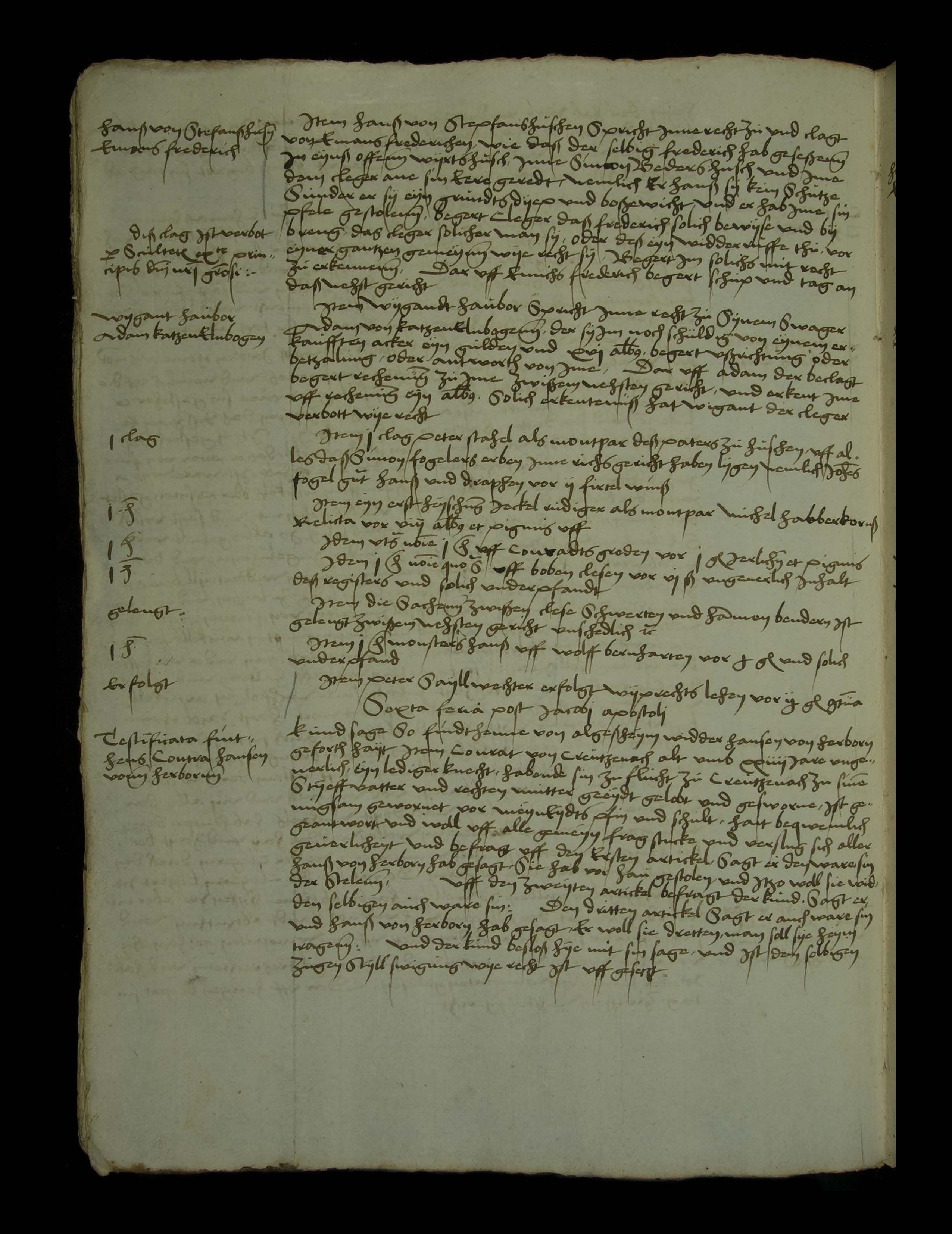 Zeugenaussage, die Hen Find von Algesheim gegen Hans von Herborn geführt hat. Konrad von Kreuznach, ungefähr 24 jahre alt, ein lediger Knecht, hat Zuflucht zu Kreuznach bei seinem Stiefvater und bei seiner rechtmäßigen Mutter gesucht, hat den Eid geleistet und geschworen, ist zur Genüge vor Bestrafung bei Meineid gewarnt worden, hat angemessen auf alle allgemeinen Fragen geantwortet und enthielt sich aller bösen Absicht und befragt auf den ersten Artikel, sagt er, der sei wahr. Hans von Herborn hat ausgesagt, sie habe das Heu gestohlen, und jetzt wolle sie wieder stehlen. Auf den zweiten Artikel befragt sagt der Zeuge, das der ebenfalls wahr sei. Der dritte Artikel sei auch wahr. Hans von Herborn hat gesagt, er wolle sie so treten, dass man sie heimtragen müsse. Und der Zeuge beschloss seine Aussage. Und ist dem Zeugen Stillschweigen aufgetragen worden, wie es Recht ist.