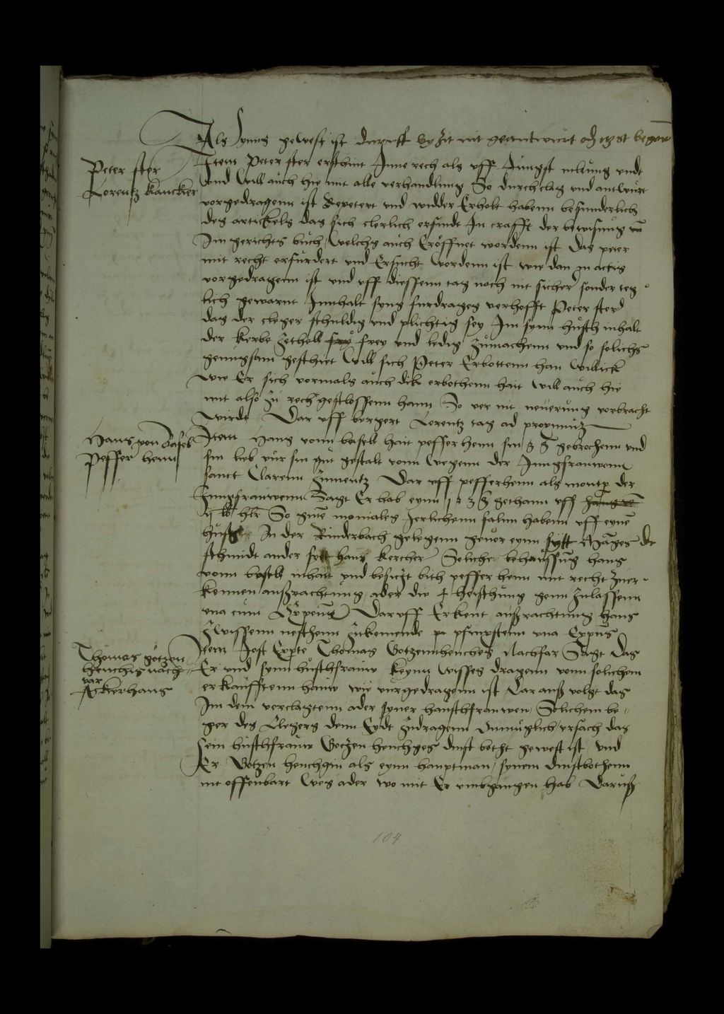Peter Stern erscheint vor Gericht wegen der jüngst geschehenen Vorbringung und er will auch hiermit alle Verhandlung, die durch Klage und Antwort vorgetragen wurde, wiederholt und erneuert haben, besonders den Artikel, in dem sich klar findet der rechtskräftige Beweis und ebenso im Gerichtsbuch, das auch geöffnet wurde und das von Peter vor Gericht gefordert wurde, wie in den Akten vorgetragen. Und es ist bis heute noch nicht gesichert. Gemäß seinem Vortrag hofft Peter Stern, dass der Kläger schuldig und verpflichtet sei, ihm sein Haus gemäß dem Kerbzettel frei zu machen von allen Belastungen. Und wenn dies geschehen ist, dann ist Peter bereit und willig, wie er auch bereits oft angeboten hat. Damit beschließt er seine Aussage vor Gericht, wenn nicht eine Neuerung vorgebracht werde. Darauf fordert Lorentz seinen Tag bis zum nächsten Gerichtstermin.